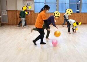 友だちと一緒に体を動かして、協力意識(友達の為に準備を行う)、仲間意識(友達が頑張っているから僕も頑張るや)、競争意識(○○君には負けたくないなど)を養っていき、そのような中で人と関わり、友だちとの距離間、空気を読むことを学んでいきます。