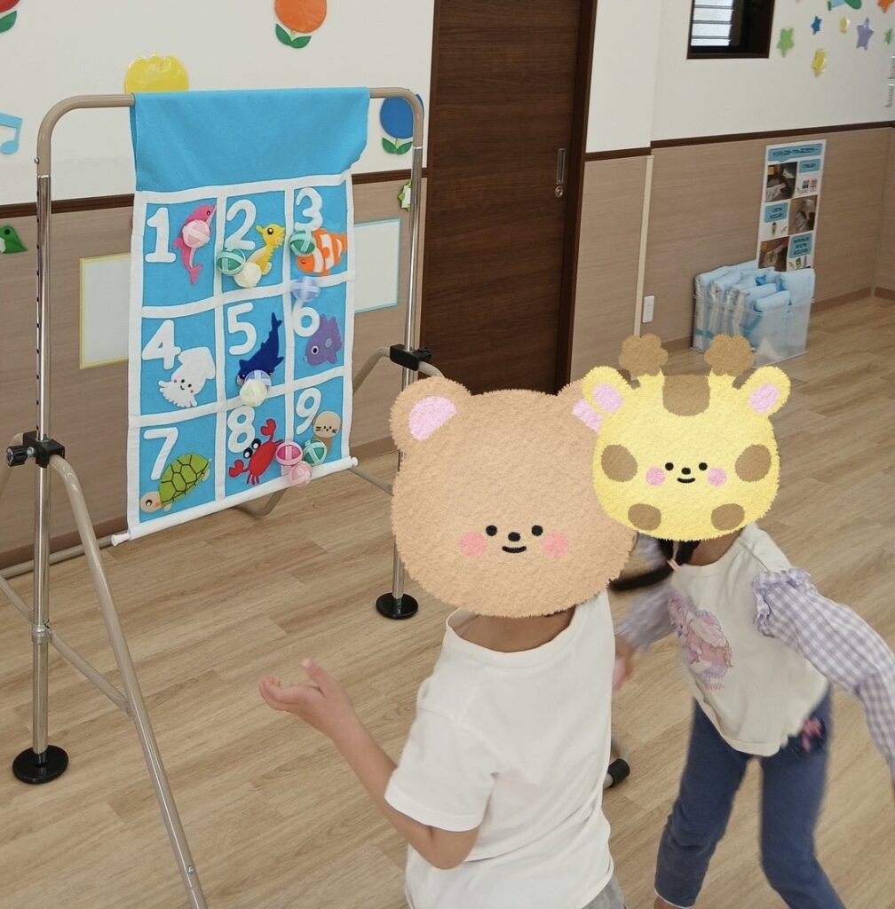 ボールにマジックテープがついているため、的にボールがくっつく感覚を楽しんで取り組んでいます。