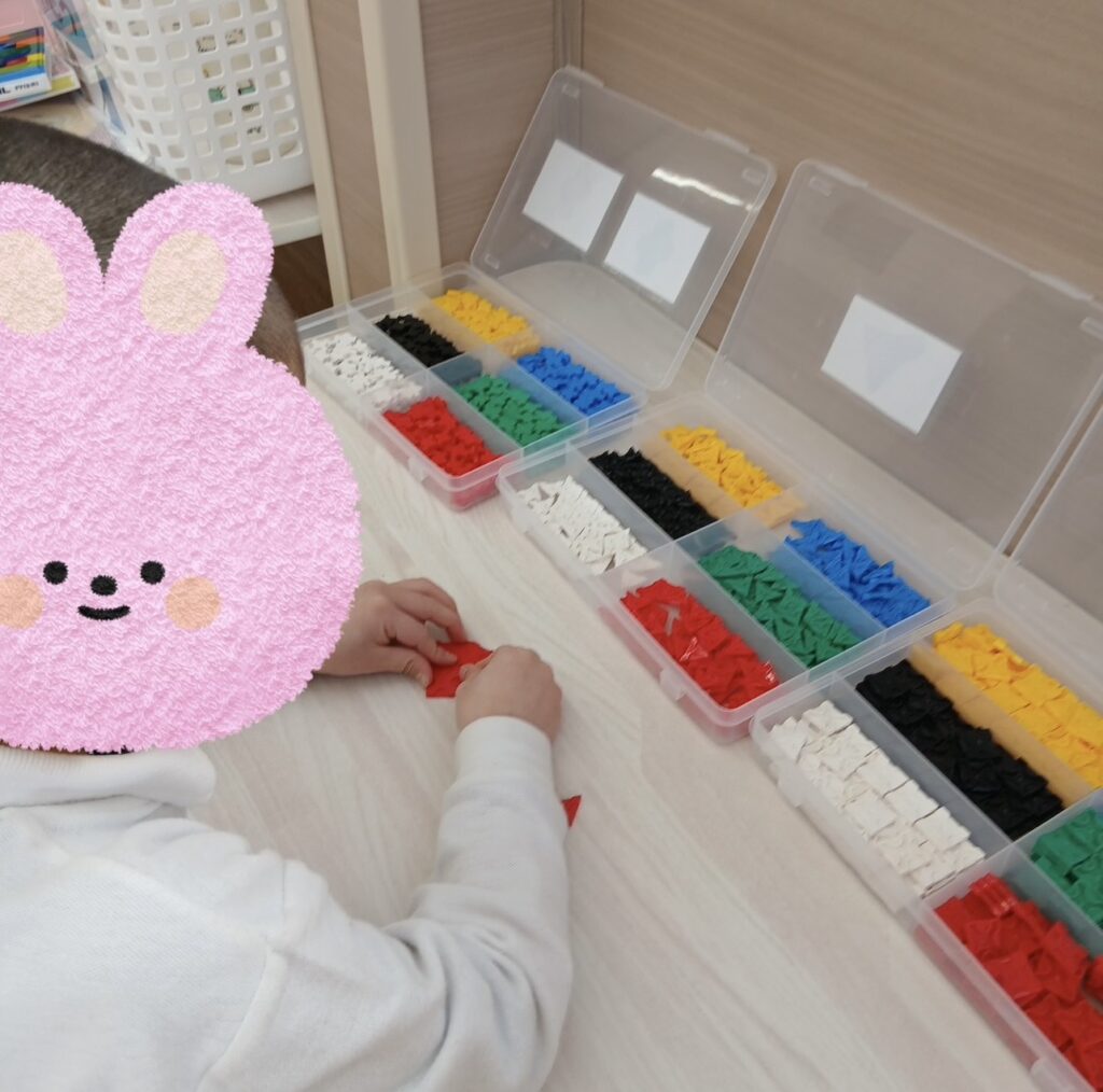 普段の微細運動の時間は中々集中できない子も30分ほど長い時間集中して取り組めている姿が見られます。