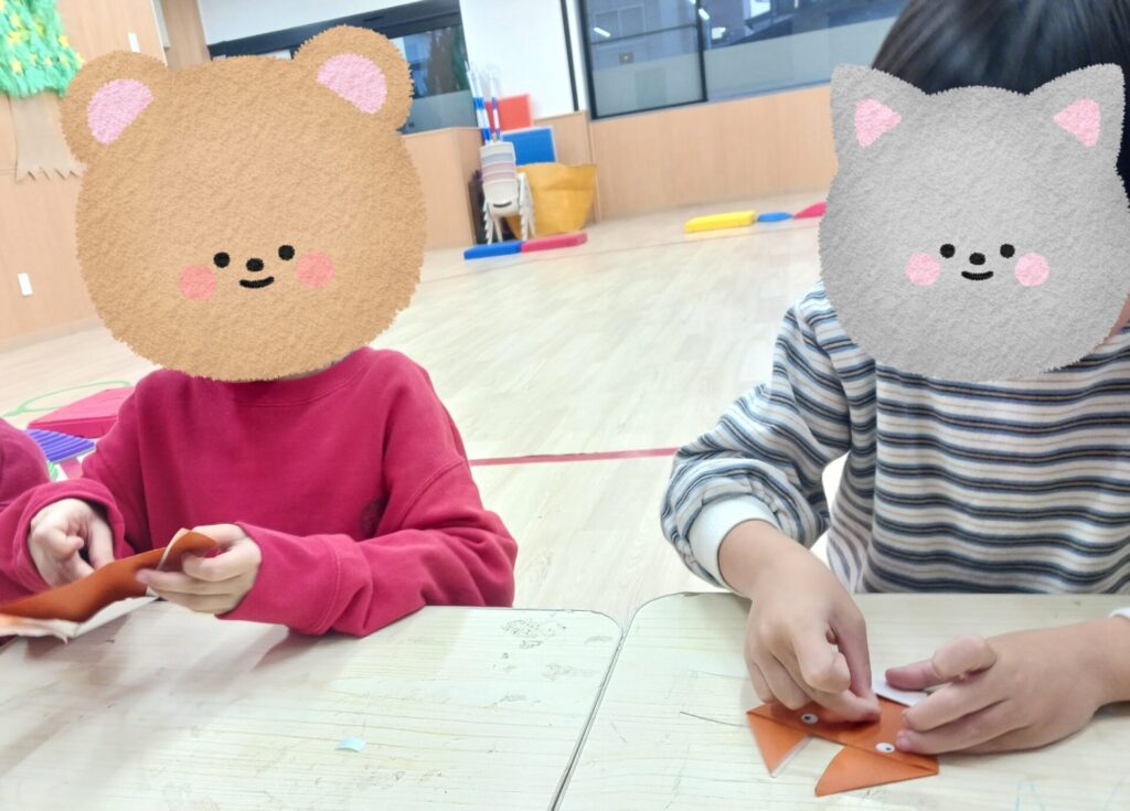 スタッフの説明を聞きながら三角に折ったり半分に折ったりなど真剣な表情で取り組む姿が見られました!その中で「ここどうやって折るの?」とスタッフに質問する子や「上手にできた!見て!」と教えてくれる子など色々な様子が見られました!