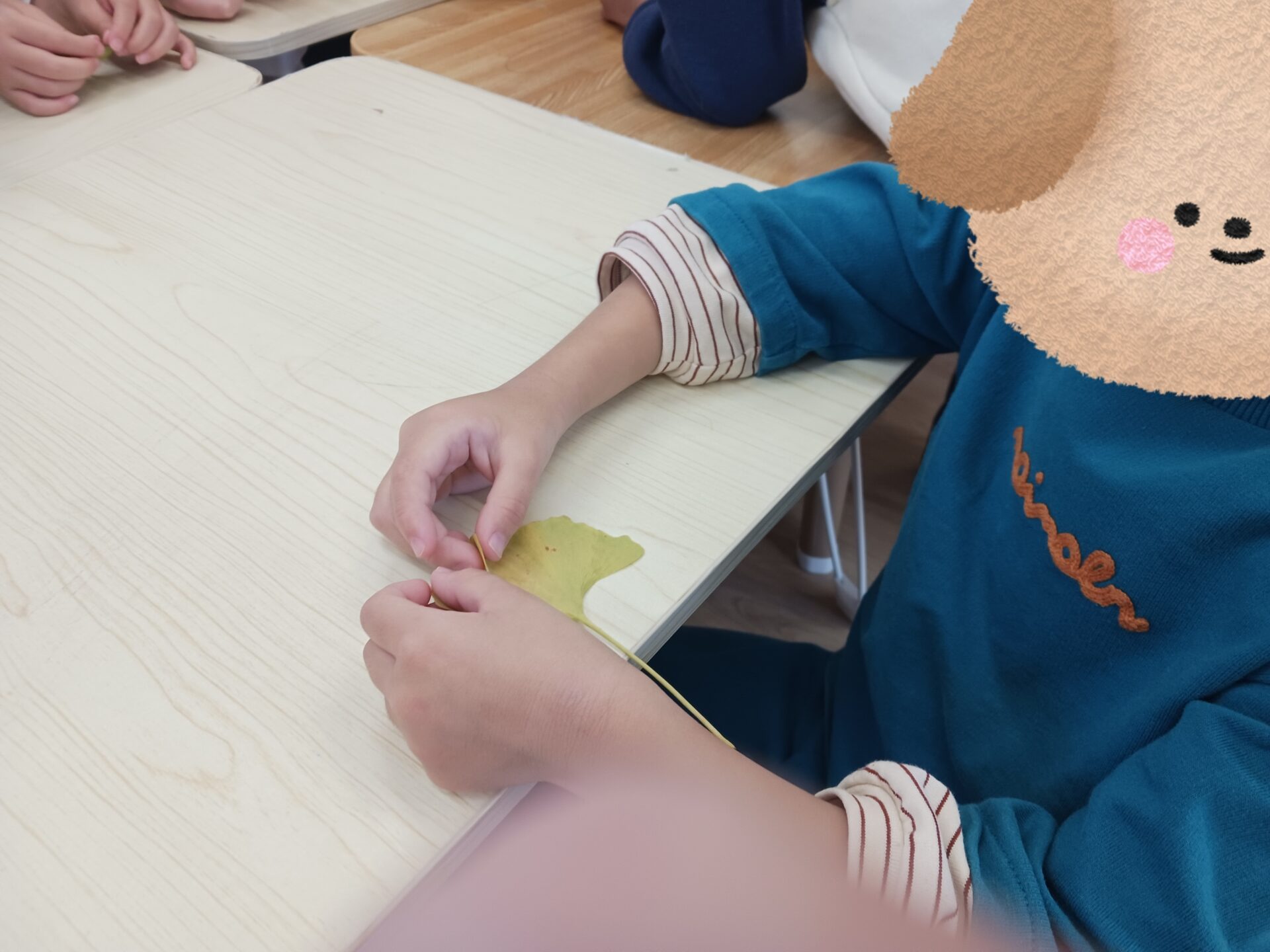 秋と言えばイチョウの木!みんなにイチョウの葉を配りどんな質感なのか、匂い、見た目など実際に体験してもらいました!🍂「かわいい!」「変なにおい!」などその子その子によってバラバラな感想が出ていましたよ!