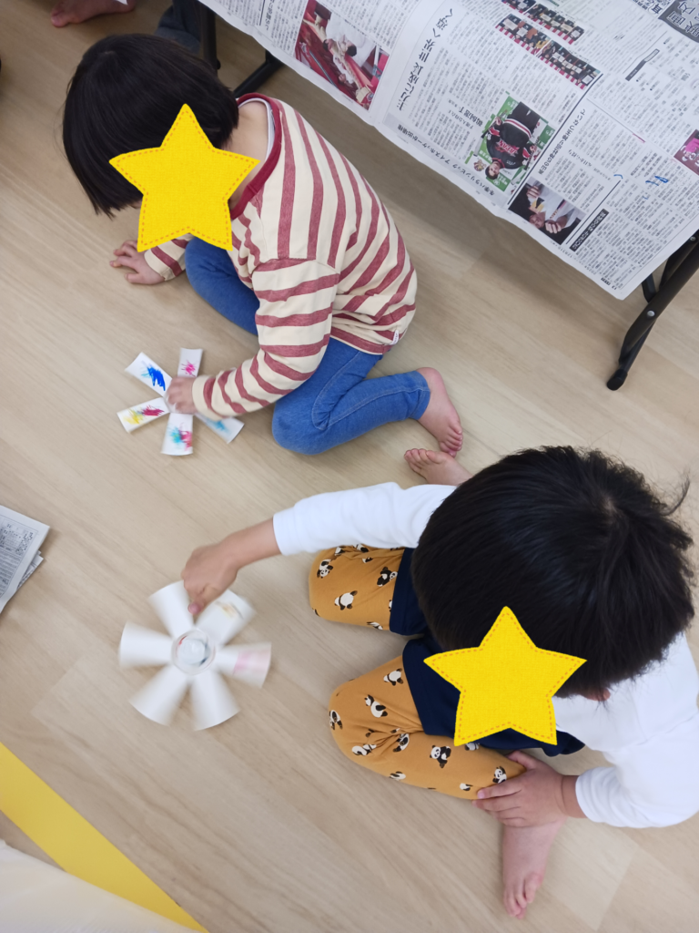 自分たちで作ったコマで遊びながら、「一緒にコマ回そう!」と自分から誘ったり、「こうやって回すんだよ」と自分なりの遊びを友達に伝える子など、普段は自分から誘うことが難しい子や一人遊びが多い子も友だちと楽しく参加してくれました!!🙌