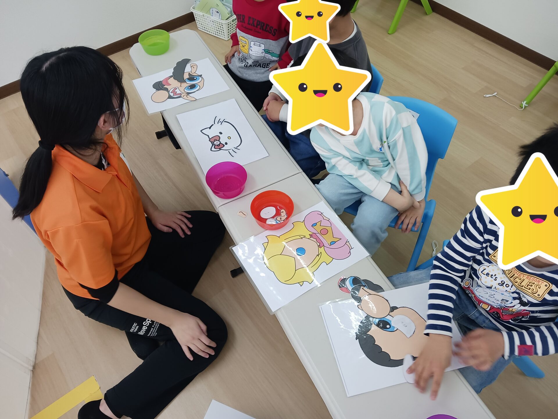 最初にまじめにキャラクターの顔を作った後は、面白い顔になるように自分たちで工夫したり、お友達と見せ合うなどして、とても微笑ましい福笑いとなっておりました!