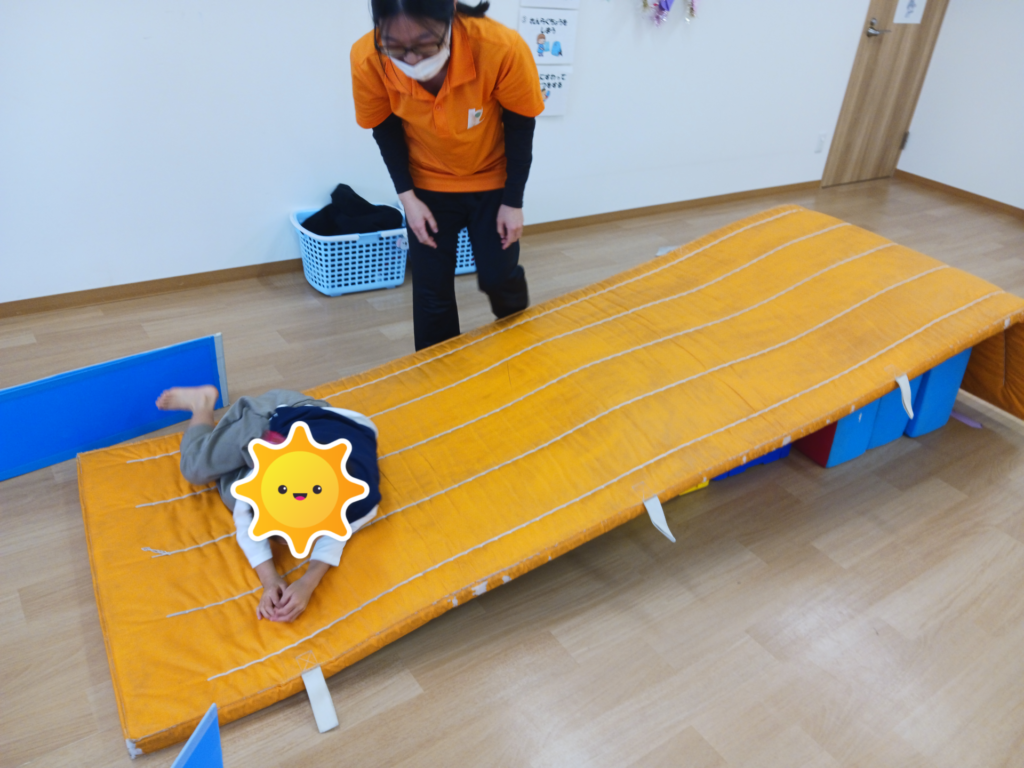 跳び箱等を用いて作った坂道のマットでは指導員が提示した自由な降り方で下っています。🛝