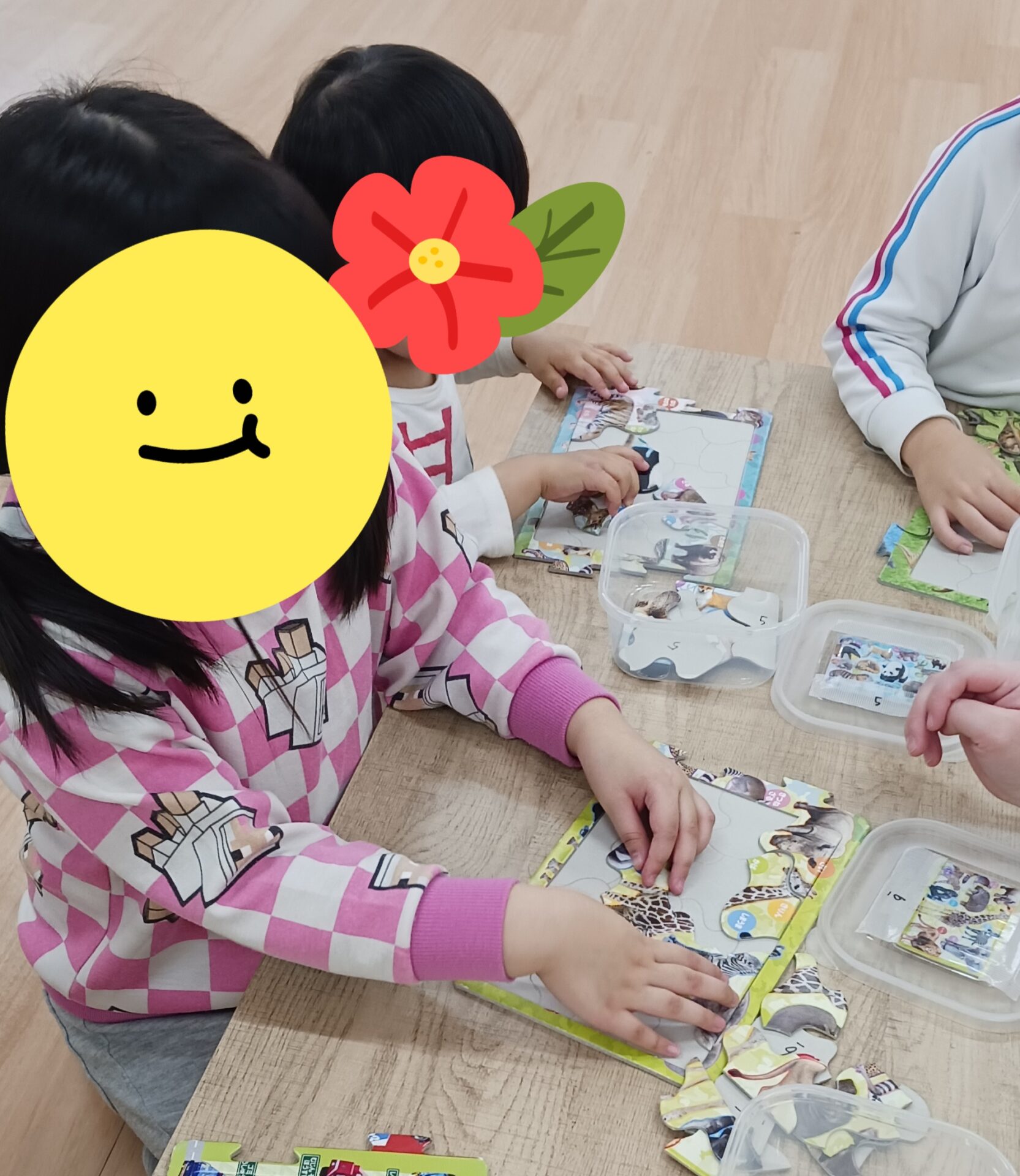 平面のパズルでは動物や車、恐竜のイラストが描かれています。ピースをはめるごとに「パトロールカーだ!」などと教えてくれる子もいます🤗また全部が完成したときは「できたー!!」と喜ぶ姿が見られます。ピースが少ないパズルから行っていき、少しずつピースの多いパズルにも挑戦してくれています!
