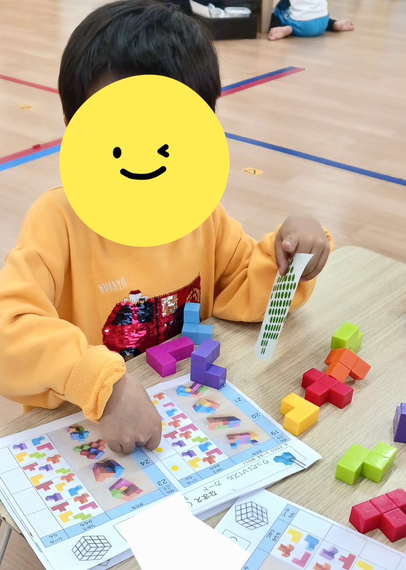 立体のパズルでは表と同じ形を作り、取り組んでいます。レベル10以上になるとスタッフでも「難しい~💦」と思う難易度も・・・しかし子ども達は諦めずに頑張って取り組んでくれています😄完成すると表にシールを貼ることができます。達成感を味わせるように支援しています。分からない時や難しい時に「手伝って」と言うことが苦手な子も、「手伝って!」や「これどうやってやるの~?」とスタッフに伝えることができるようになってきました!✨