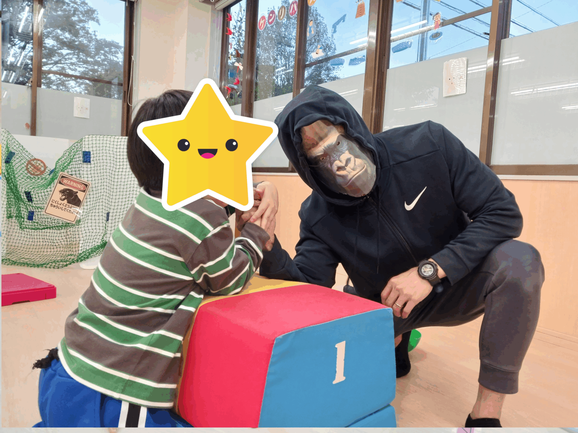 ワクワクしながら、部屋を歌いながら歩いていくと、子ゴリラとの腕相撲対決!